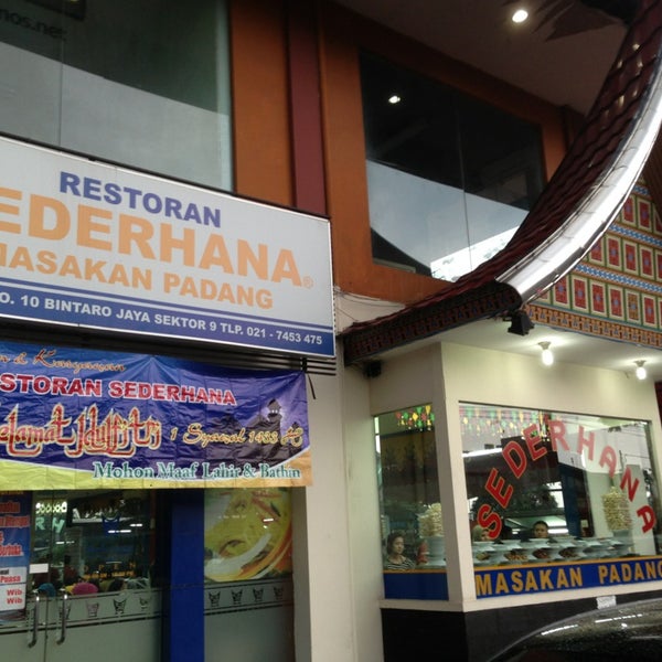 Rumah makan sederhana bintaro. Restoran Sederhana Bintaro Jakarta. Rumah makan sederhana banyak tapi saya selalu pilih yang bintaronya ada rasa yang lebih dibandingkan dengan sederhana lainnya tentu ini masalah lidah dan selera umumnya orang yang rekomendasi bilang enak terutama rendangnya empuk dan berwarna coklat gelap telor gulainya meresap dendeng baladonya tidak keras semua. Saat masih bermitra Djamilus mengelola dua rumah makan Padang dengan nama Sederhana Bintaro yang terletak di kompleks perumahan Bintaro sektor I dan VII.